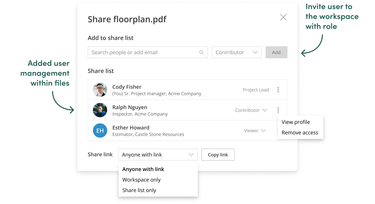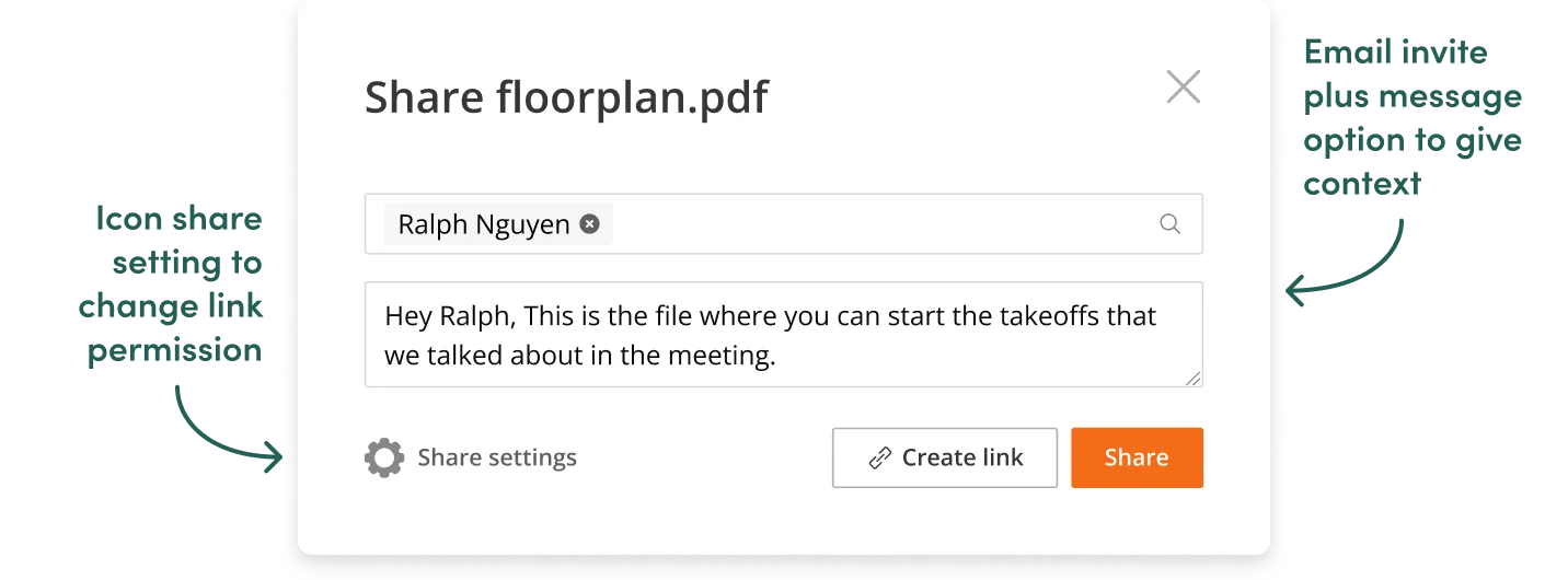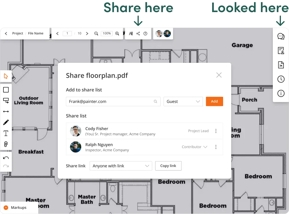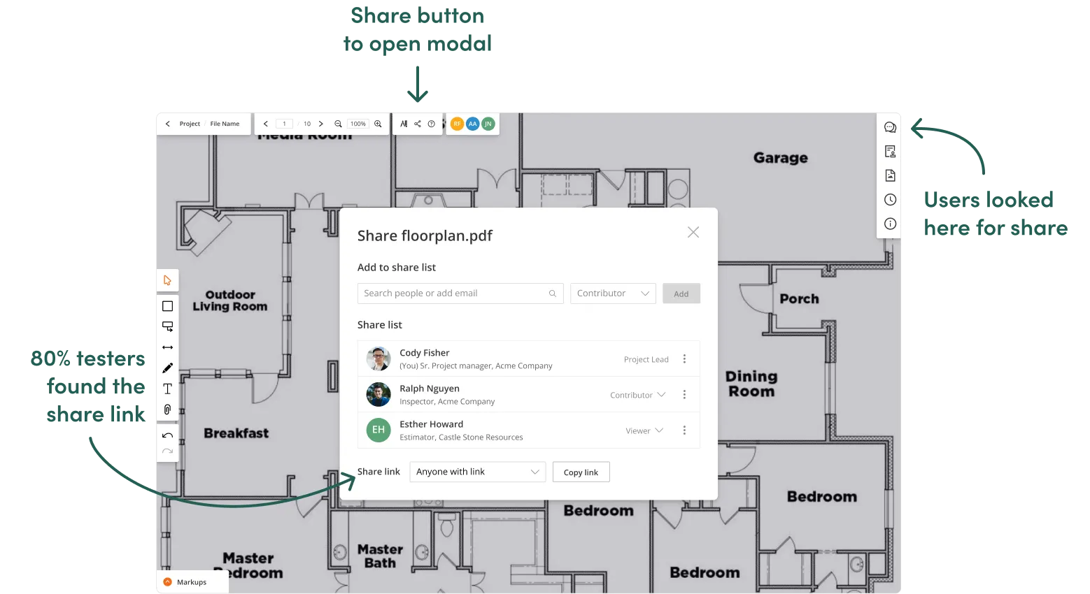 After establishing how to protect sensitive files, I explored how our users could share files. This key collaboration point occurred in the document markup page, when users wanted input from their team and subcontractors.