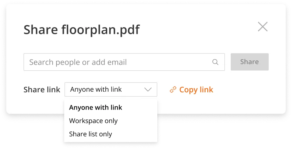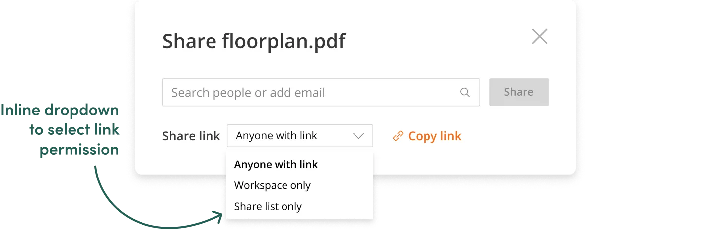 The challenge of sharing a file by link is determining who should be able to access it. At first, I focused on creating very granular levels of security to accommodate a variety of team structures.