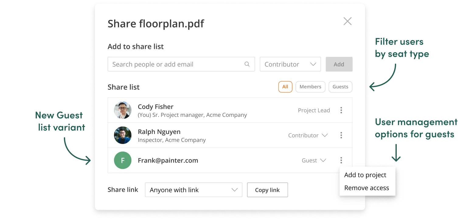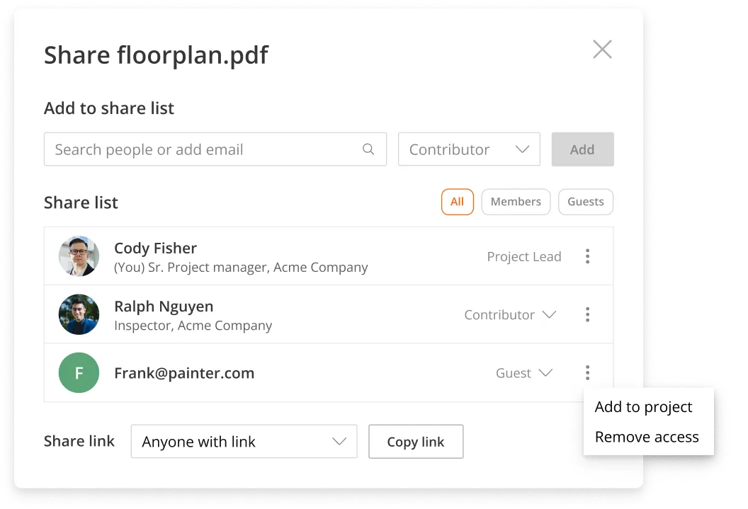 Testing revealed a preference of sending emails, a preference of the construction world, so I added the option to the share list section. Now users could invite guests by email and link, providing further flexible collaboration.